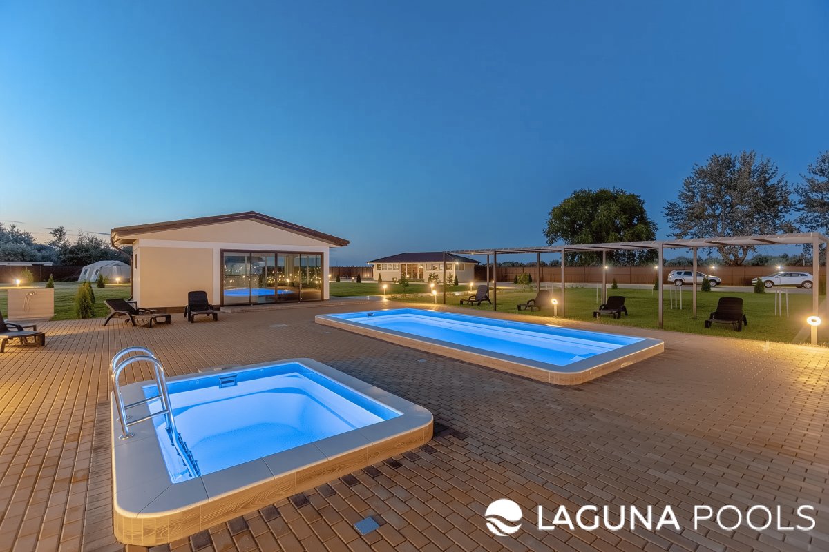 Два композитных бассейна с подсветкой и шезлонгами на брусчатке в вечернее время.